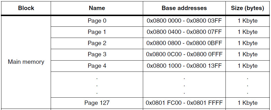 应用程序对NOR芯片操作以"字"为基本单位(不是以字节吗?--Jelline注)。为了方便对大容量NOR闪存的管理,通常将NOR闪存分成大小为128KB或者64KB的逻辑块,有时候块内还分成扇区(是不是有的芯片也叫页,如下面的例子--Jelline注)。读写时需要同时指定逻辑块号和块内偏移[7]。举个例子,STM32F103RBT6的Flash是128KB,1KB/页(可以从芯片参考手册得知),如下图所示: